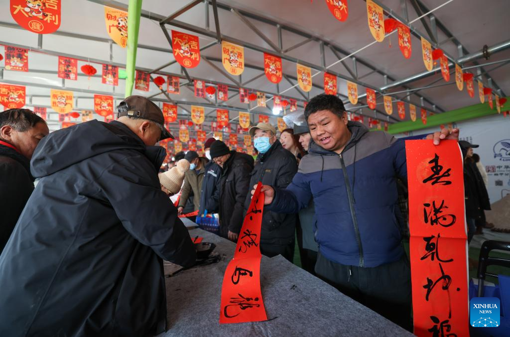 People collect New Year couplets at an open air market during the Laba Festival in Tianjin, north China, Jan. 26, 2026. This year's Laba Festival falls on Monday, coinciding with the opening of the Lutai Market in Tianjin. The market features traditional activities such as free distribution of Laba porridge, calligraphy of the character "Fu" for blessings, and a village chef competition, attracting numerous residents from surrounding areas. (Xinhua/Sun Fanyue)
