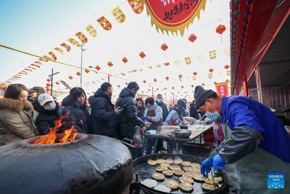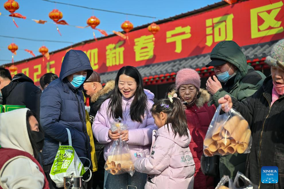 People buy food at an open air market during the Laba Festival in Tianjin, north China, Jan. 26, 2026. This year's Laba Festival falls on Monday, coinciding with the opening of the Lutai Market in Tianjin. The market features traditional activities such as free distribution of Laba porridge, calligraphy of the character "Fu" for blessings, and a village chef competition, attracting numerous residents from surrounding areas. (Xinhua/Sun Fanyue)
