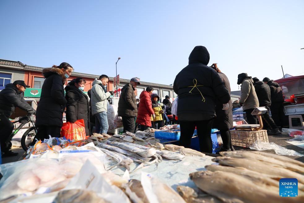 People select products at an open air market during the Laba Festival in Tianjin, north China, Jan. 26, 2026. This year's Laba Festival falls on Monday, coinciding with the opening of the Lutai Market in Tianjin. The market features traditional activities such as free distribution of Laba porridge, calligraphy of the character "Fu" for blessings, and a village chef competition, attracting numerous residents from surrounding areas. (Xinhua/Sun Fanyue)