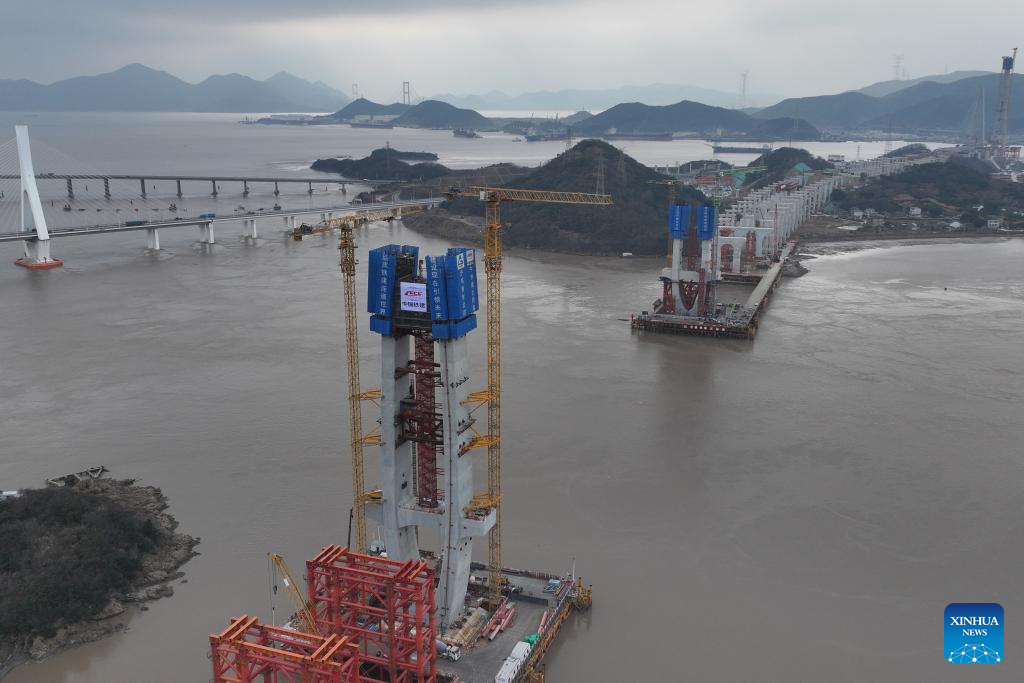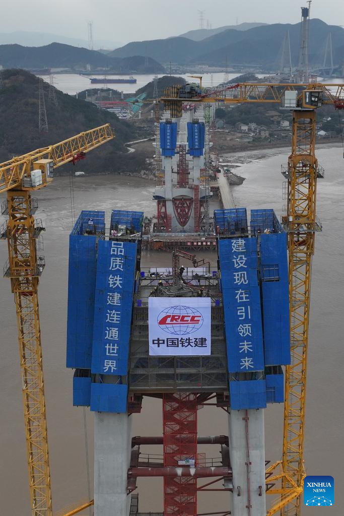 An aerial drone photo taken on Jan. 25, 2026 shows the concrete pouring site of the crossbeam on the east main tower of the Fuchimen road-rail bridge on the Ningbo-Zhoushan Railway in Zhoushan, east China's Zhejiang Province. The concrete pouring operation for the crossbeam on the east main tower of the Fuchimen road-rail bridge was completed successfully on Sunday, marking a breakthrough in the main tower's primary structure construction and laying a foundation for the subsequent construction of the entire bridge deck system.