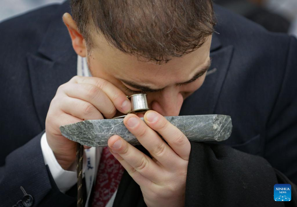 Attendees view mineral rock samples during the Association for Mineral Exploration (AME) Roundup 2026 at the Vancouver Convention Centre in Vancouver, British Columbia, Canada, on Jan. 26, 2026. The AME Roundup 2026 kicked off here on Monday, featuring a four-day exhibition with exhibitors from around the world showcasing products, technologies and services related to mineral exploration and development. The event runs from Jan. 26 to Jan. 29. (Photo by Liang Sen/Xinhua)