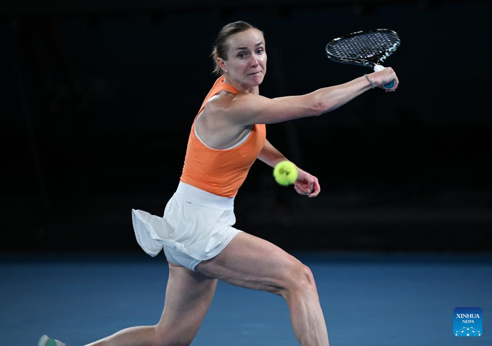 Elina Svitolina hits a return during the women's singles quarterfinal match between Coco Gauff of the United States and Elina Svitolina of Ukraine at the Australian Open tennis tournament in Melbourne, Australia, Jan. 27, 2026. (Photo by Wang Shen/Xinhua)