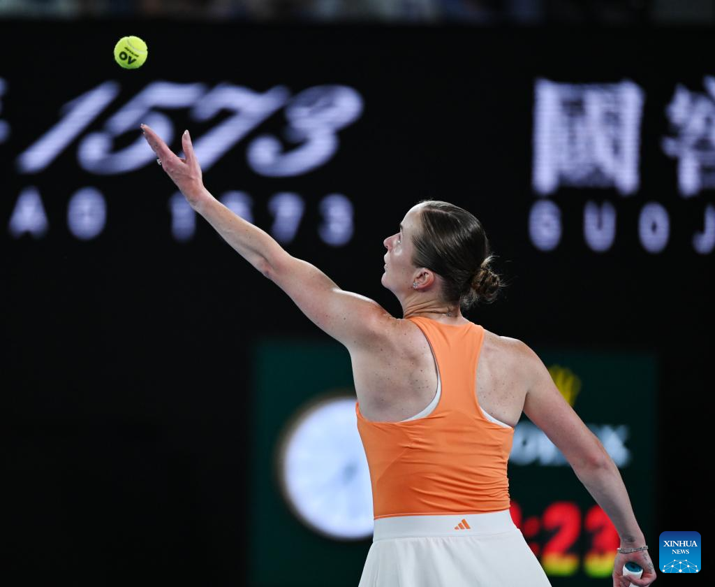 Elina Svitolina serves during the women's singles quarterfinal match between Coco Gauff of the United States and Elina Svitolina of Ukraine at the Australian Open tennis tournament in Melbourne, Australia, Jan. 27, 2026. (Photo by Wang Shen/Xinhua)