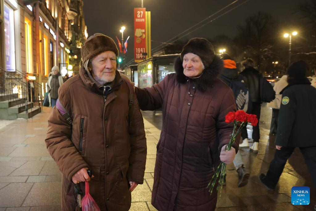 People lay flowers at a memorial in St. Petersburg, Russia, Jan. 27, 2026. A series of events are held in St. Petersburg on Jan. 27 to mark the 82nd anniversary of the victory in the Siege of Leningrad during the Great Patriotic War of the Soviet Union. (Photo by Irina Motina/Xinhua)