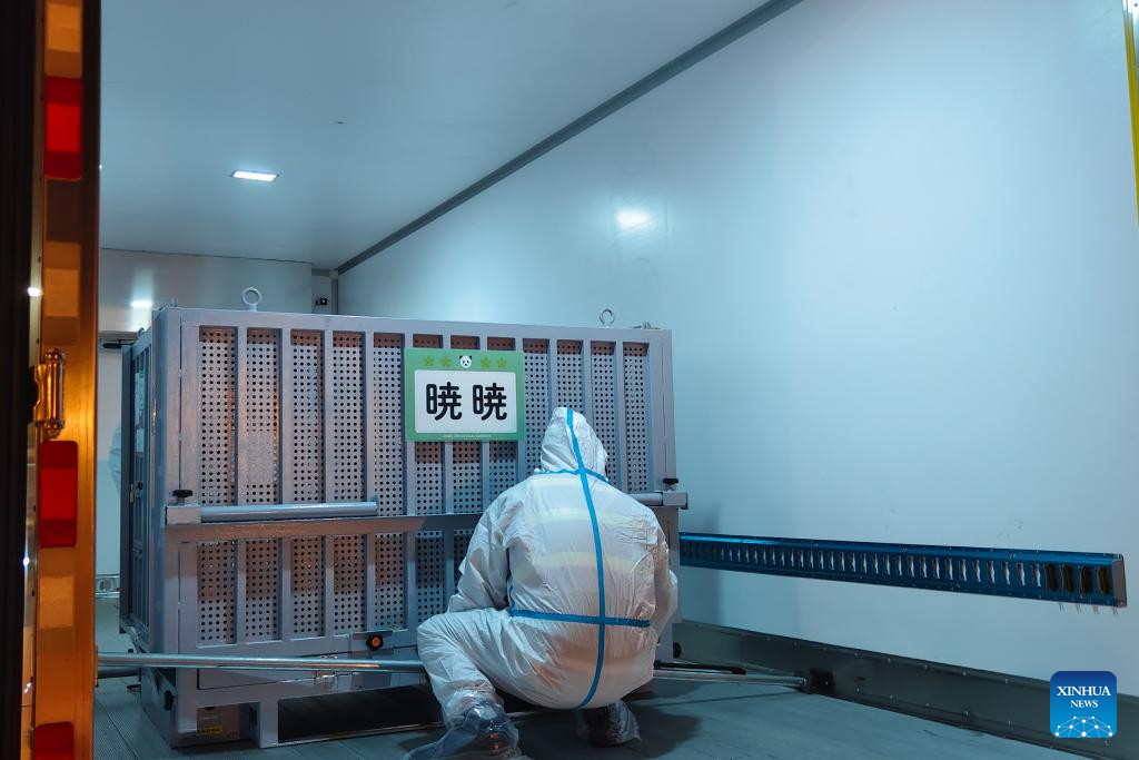 The pair, Xiao Xiao and Lei Lei, arrived at Chengdu in southwest China's Sichuan Province at 1 a.m., before they were sent to the Ya'an base of China Conservation and Research Center for the Giant Panda, where they will be quarantined.