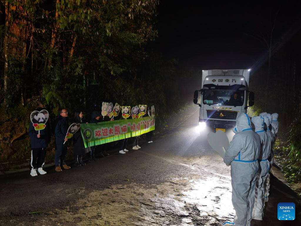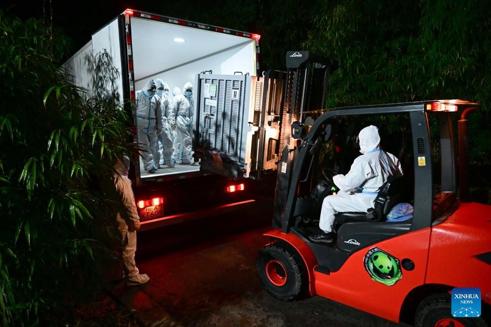Giant pandas Xiao Xiao and Lei Lei arrive at the Ya'an base of China Conservation and Research Center for the Giant Panda in southwest China's Sichuan Province on Jan. 28, 2026.