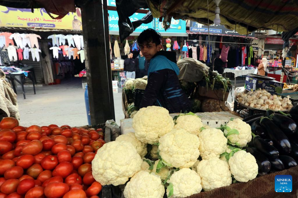 A boy tends to a vegetable stall in the Baqa'a refugee camp in Jordan, on Jan. 28, 2026.