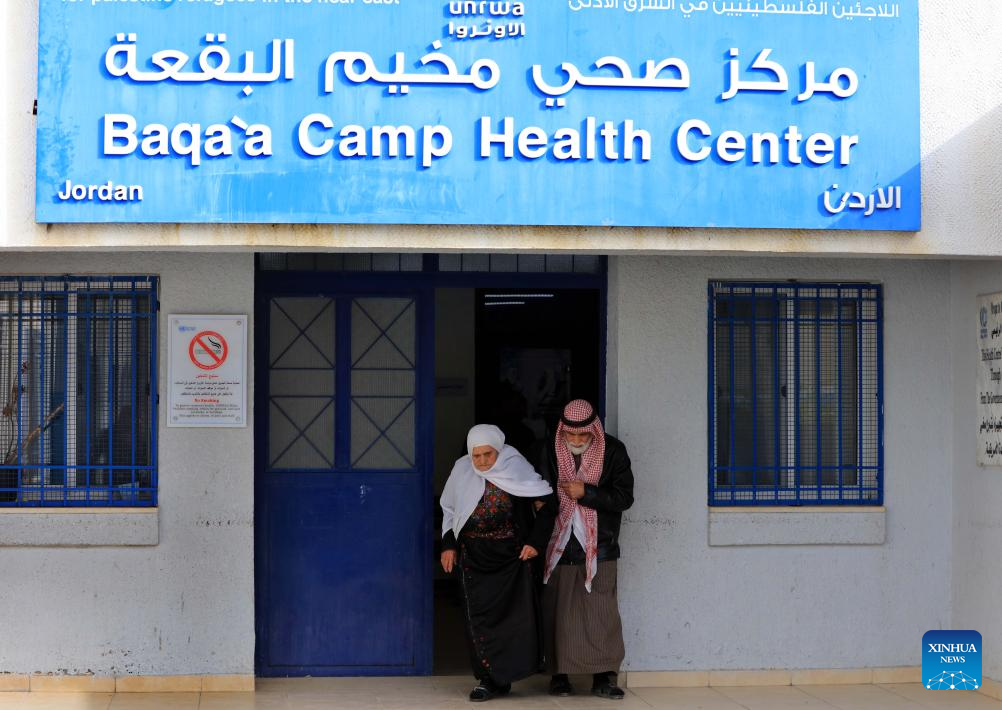 An elderly couple step out of a health center in Baqa'a refugee camp in Jordan, on Jan. 28, 2026.