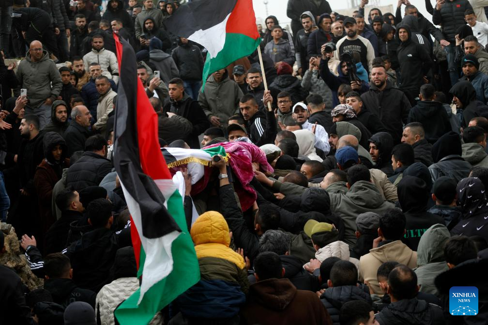 Mourners attend the funeral of Palestinian young man Mohammad Rajeh Nasrallah who was killed by the Israeli forces, in the West Bank city of Hebron, on Jan. 28, 2026. Mohammad Rajeh Nasrallah, 20 years old, died Tuesday evening from critical wounds sustained after being shot by Israeli forces during a military raid in the town of Ad-Dhahiriya, south of Hebron. (Photo by Mamoun Wazwaz/Xinhua)