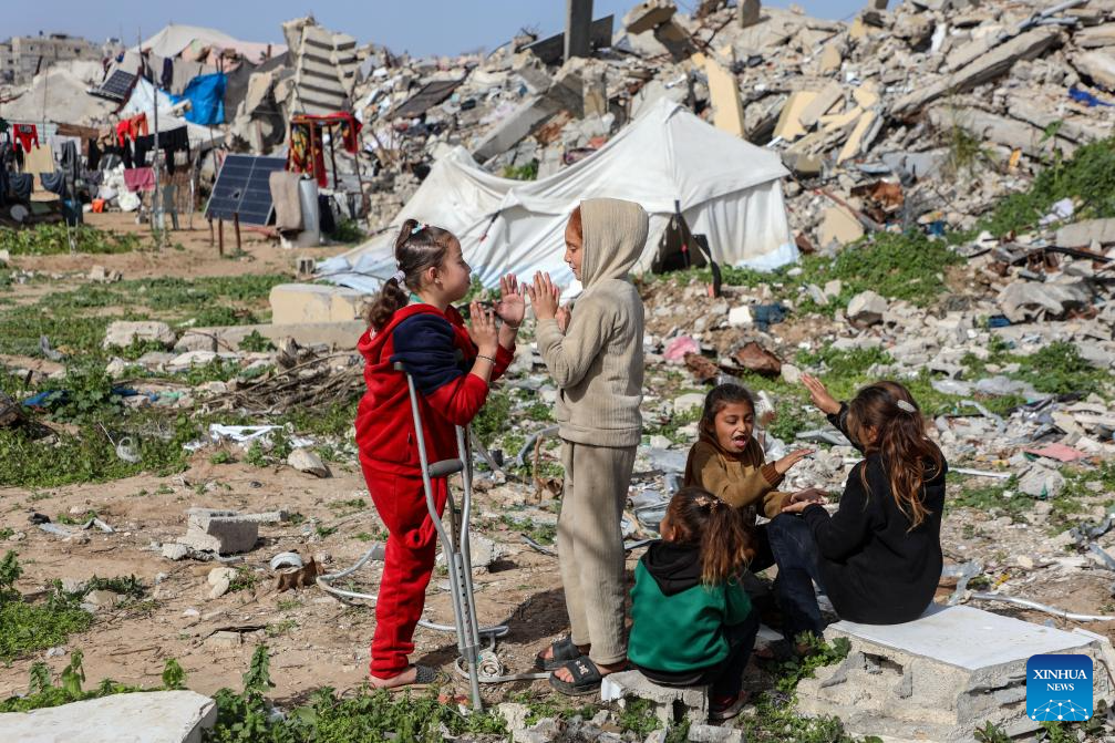 Palestinian girl Malak Khader (1st L) plays with a child at a temporary shelter east of Gaza City, on Jan. 27, 2026. The 9-year-old girl lost her leg and became the sole survivor of her family after the Israeli army bombed a shelter school where her family lived in Jabalia refugee camp, northern Gaza. Now, Malak lives with her 70-year-old grandmother who cares for her and fulfills her parents' role. (Photo by Rizek Abdeljawad/Xinhua)