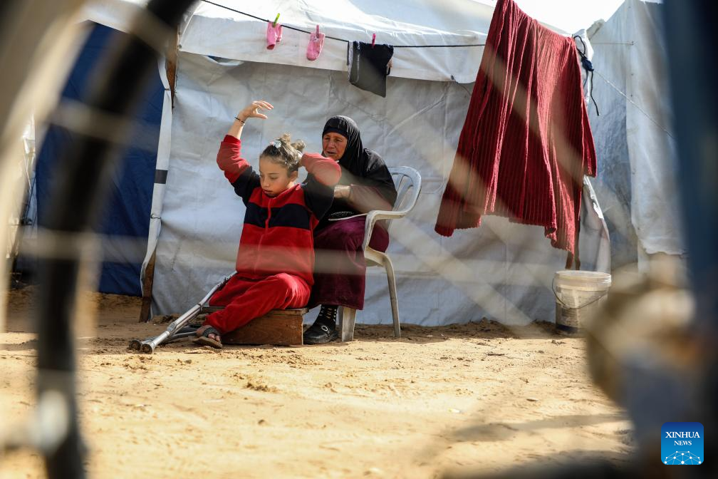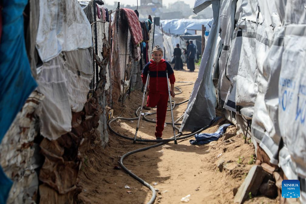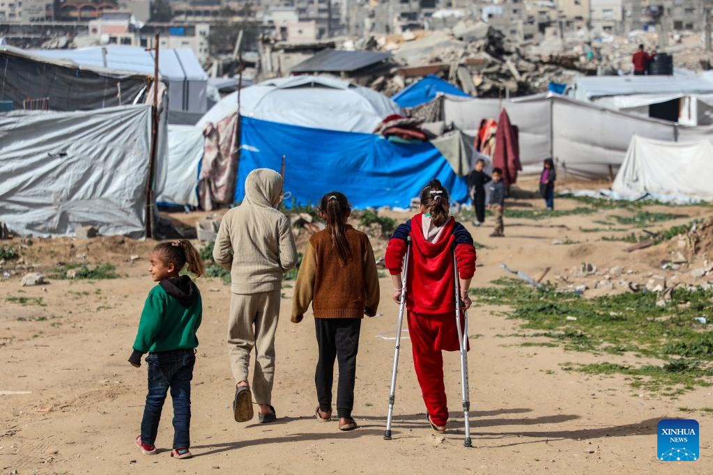 Palestinian girl Malak Khader (1st R) walks at a temporary shelter east of Gaza City, on Jan. 27, 2026. The 9-year-old girl lost her leg and became the sole survivor of her family after the Israeli army bombed a shelter school where her family lived in Jabalia refugee camp, northern Gaza. Now, Malak lives with her 70-year-old grandmother who cares for her and fulfills her parents' role. (Photo by Rizek Abdeljawad/Xinhua)