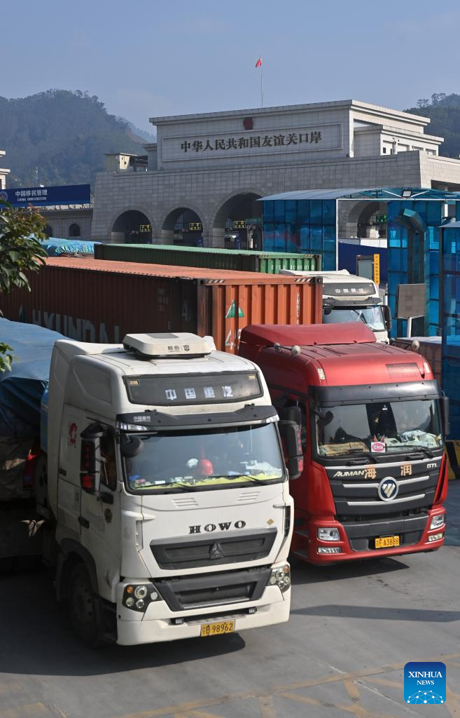 Vehicles bound for Vietnam are pictured after customs clearance at Youyiguan Port, or Friendship Pass, in Pingxiang City, south China's Guangxi Zhuang Autonomous Region, Jan. 28, 2026. Youyiguan Port, China's main gateway to Vietnam, upgraded its border clearance system in January, significantly reducing customs clearance time and providing convenience for vehicles entering and exiting. (Xinhua/Lu Boan)