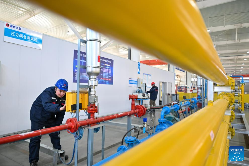 Staff members adjust a pilot test platform for a pressure coupling device at Dekuang Jiuding (Tianjin) Technology Co., Ltd. in the Beijing-Tianjin Zhongguancun Tech Town, in Tianjin, north China, Jan. 23, 2026.