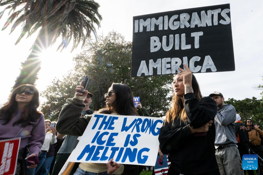 People attend a rally in San Francisco, the United States, Jan. 30, 2026. Protesters gathered across the United States on Friday for a nationwide general strike against federal immigration enforcement operations and the recent fatal shootings by immigration agents.(Photo by Ziyu Julian Zhu/Xinhua)