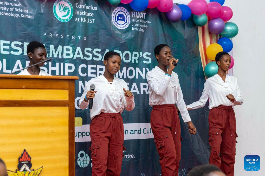 Students of the Confucius Institute at the Kwame Nkrumah University of Science and Technology (KNUST) sing a Chinese song at the award ceremony of the Chinese Ambassador's Scholarship in Kumasi, Ghana, Jan. 30, 2026. The Confucius Institute at the KNUST in collaboration with the Chinese Embassy in Ghana on Friday awarded 71 KNUST cadets the Chinese Ambassador's Scholarship in Kumasi, Ghana's second-largest city. (KNUST Confucius Institute/Handout via Xinhua)