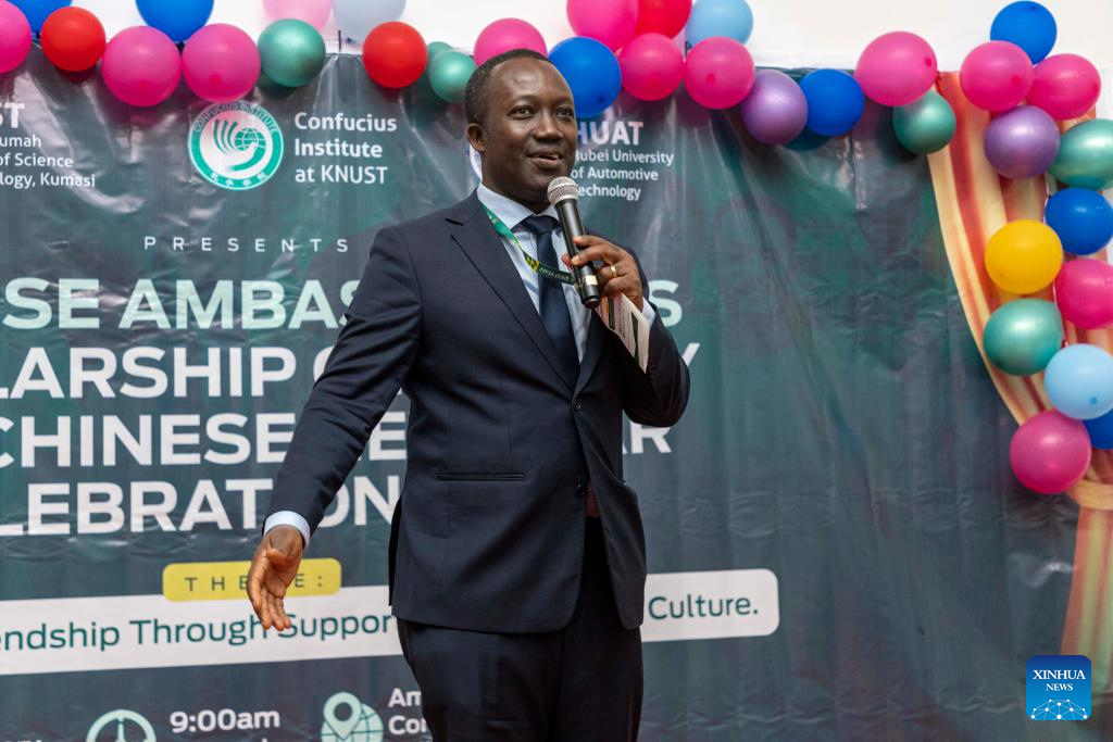 Daniel Duah, the Ghanaian director of the Confucius Institute at the Kwame Nkrumah University of Science and Technology (KNUST), speaks at the award ceremony of the Chinese Ambassador's Scholarship in Kumasi, Ghana, Jan. 30, 2026. The Confucius Institute at the KNUST in collaboration with the Chinese Embassy in Ghana on Friday awarded 71 KNUST cadets the Chinese Ambassador's Scholarship in Kumasi, Ghana's second-largest city. (KNUST Confucius Institute/Handout via Xinhua)