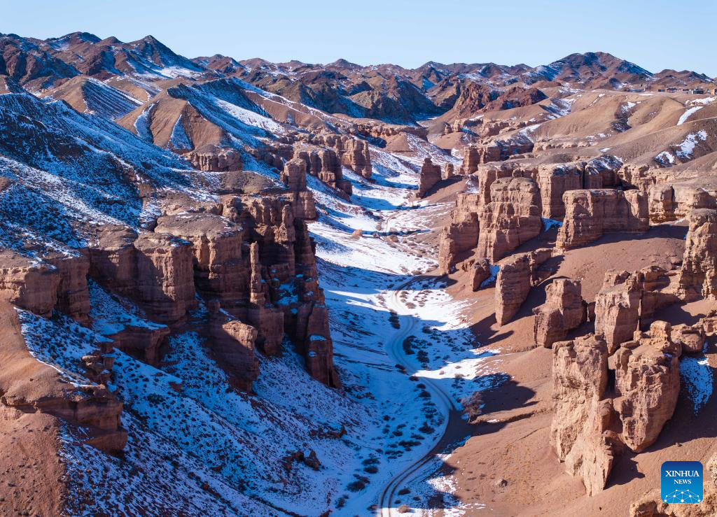An aerial drone photo taken on Jan. 30, 2026 shows the scenery of the Charyn Canyon in Almaty Region, Kazakhstan. (Xinhua/Li Renzi)