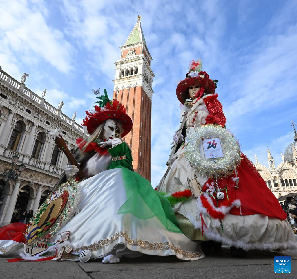 Revelers dressed in the theme of the 2026 Milano-Cortina Winter Olympic Games pose at St. Mark's Square during the Venice Carnival 2026 in Venice, Italy, Jan. 31, 2026. The 2026 version of the traditional Venice Carnival runs from Jan. 31 to Feb. 17. (Photo by Alberto Lingria/Xinhua)