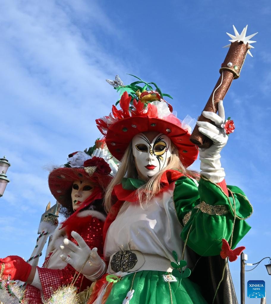 A reveler poses at St. Mark's Square during the Venice Carnival 2026 in Venice, Italy, Jan. 31, 2026. The 2026 version of the traditional Venice Carnival runs from Jan. 31 to Feb. 17. (Photo by Alberto Lingria/Xinhua)