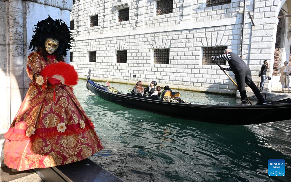 A reveler poses with a gondola near the Grand Canal during the Venice Carnival 2026 in Venice, Italy, Jan. 31, 2026. The 2026 version of the traditional Venice Carnival runs from Jan. 31 to Feb. 17. (Photo by Alberto Lingria/Xinhua)