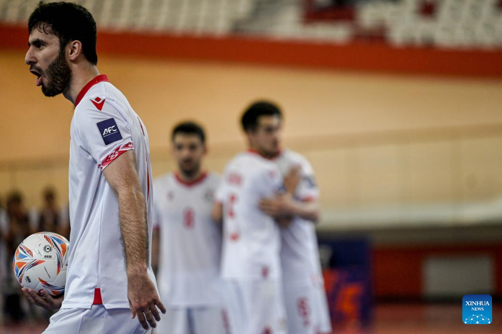 Team players of Tajikistan react after scoring during the Group C match between Tajikistan and Australia at the AFC Futsal Asian Cup 2026 in Jakarta, Indonesia, Feb. 1, 2026. (Xinhua/Agung Kuncahya B.)