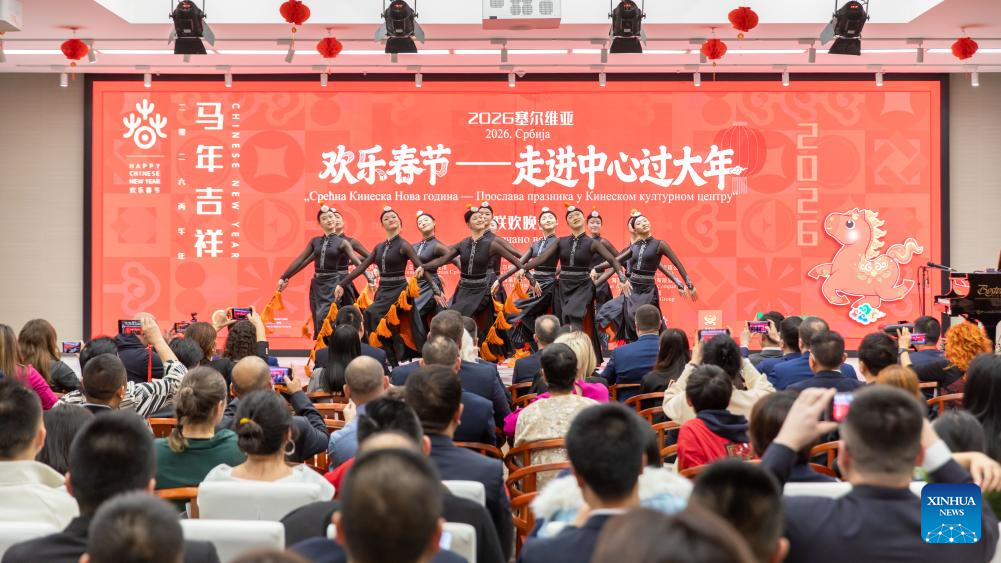 Artists stage a folk dance at the Chinese Cultural Center in Belgrade, Serbia, Jan. 30, 2026. An immersive music and opera gala at the Chinese Cultural Center in Belgrade drew hundreds of attendees on Friday evening, marking the launch of the 2026 Chinese New Year celebrations in Serbia. (Photo by Wang Wei/Xinhua)
