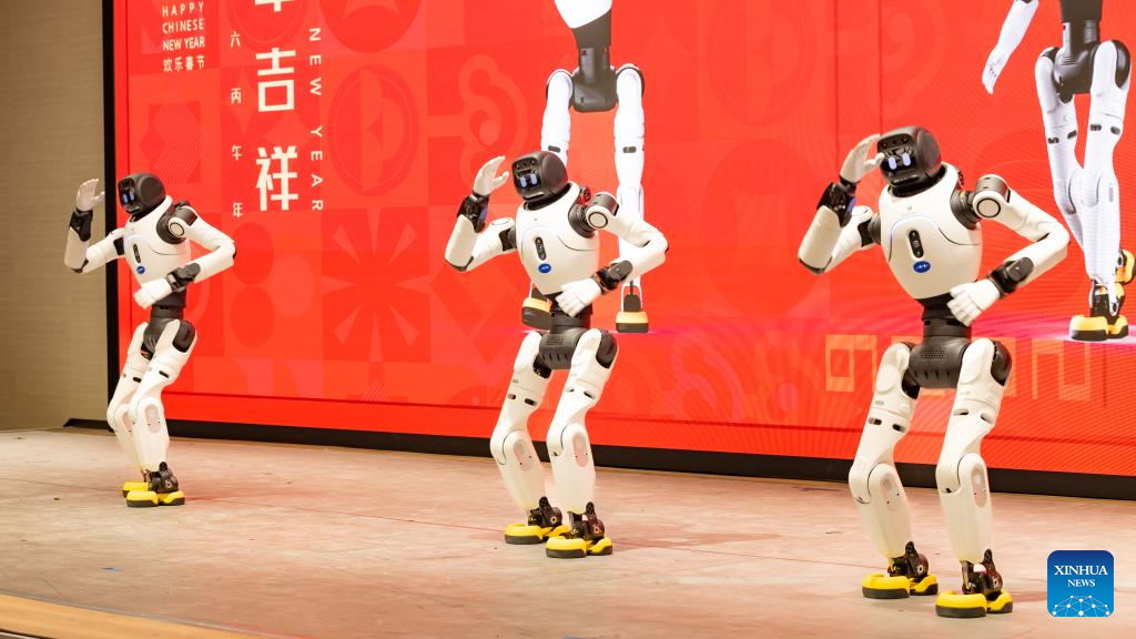 Humanoid robots stage a performance at the Chinese Cultural Center in Belgrade, Serbia, Jan. 30, 2026. An immersive music and opera gala at the Chinese Cultural Center in Belgrade drew hundreds of attendees on Friday evening, marking the launch of the 2026 Chinese New Year celebrations in Serbia. (Photo by Wang Wei/Xinhua)