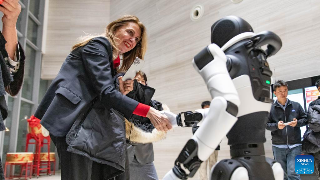 A visitor interacts with a humanoid robot at the Chinese Cultural Center in Belgrade, Serbia, Jan. 30, 2026. An immersive music and opera gala at the Chinese Cultural Center in Belgrade drew hundreds of attendees on Friday evening, marking the launch of the 2026 Chinese New Year celebrations in Serbia. (Photo by Wang Wei/Xinhua)