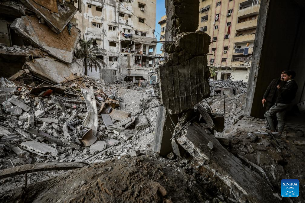 Palestinians inspect the damage following Israeli airstrikes in Gaza City, on Jan. 31, 2026. At least 32 Palestinians were killed in a series of Israeli airstrikes across the Gaza Strip late Friday and midday Saturday, Palestinian sources said, with attacks targeting a police station, residential apartments and displacement tents. The strikes came as Israel said it was responding to a Hamas breach of the ceasefire, which Hamas rejected as "false and misleading." (Photo by Rizek Abdeljawad/Xinhua)
