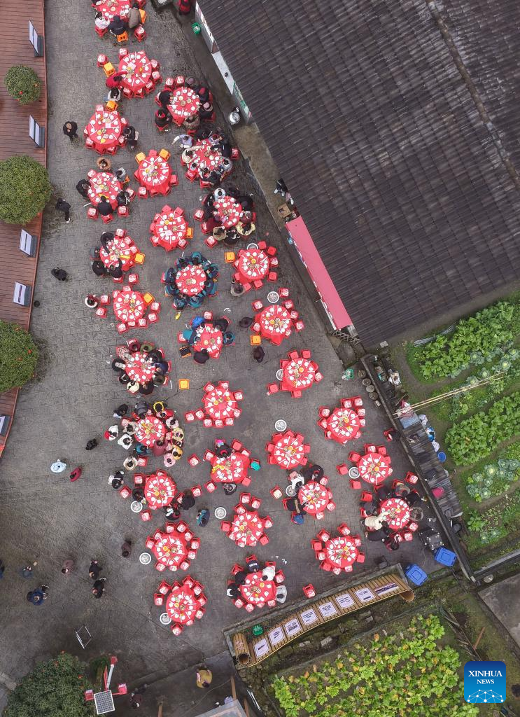 This aerial drone photo taken on Feb. 1, 2026 shows a banquet held during the Spring Festival gala in Shenshan Village, Jinggangshan City of east China's Jiangxi Province. With the Spring Festival drawing near, Shenshan Village in Jinggangshan City held a Spring Festival gala that invited residents from seven nearby counties in east China's Jiangxi and central China's Hunan provinces to participate. (Xinhua/Zhou Mi)