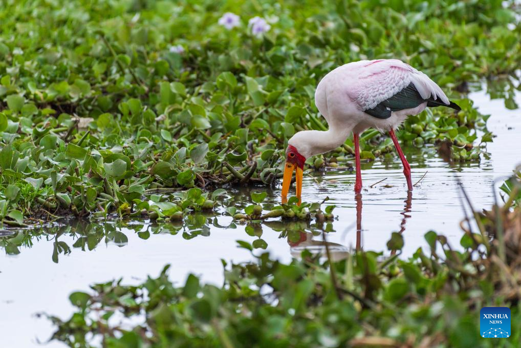 A yellow-billed stork forages in Lake Naivasha in Nakuru County, Kenya, Feb. 1, 2026. World Wetlands Day is observed annually on Feb. 2 to raise global awareness of the vital role of wetlands for people, nature and culture.