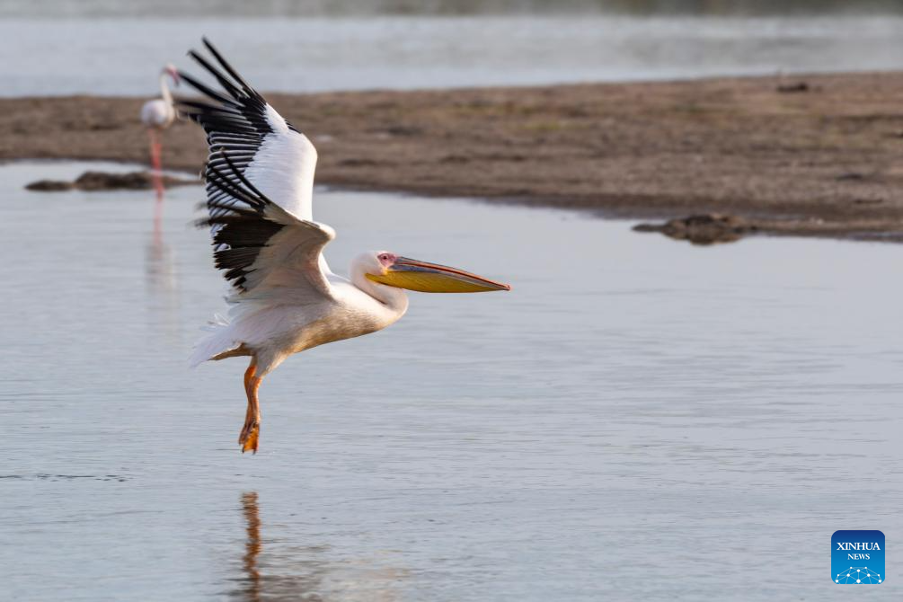 A pelican flies over Lake Amboseli in Kajiado County, Kenya, Jan. 8, 2026. World Wetlands Day is observed annually on Feb. 2 to raise global awareness of the vital role of wetlands for people, nature and culture.