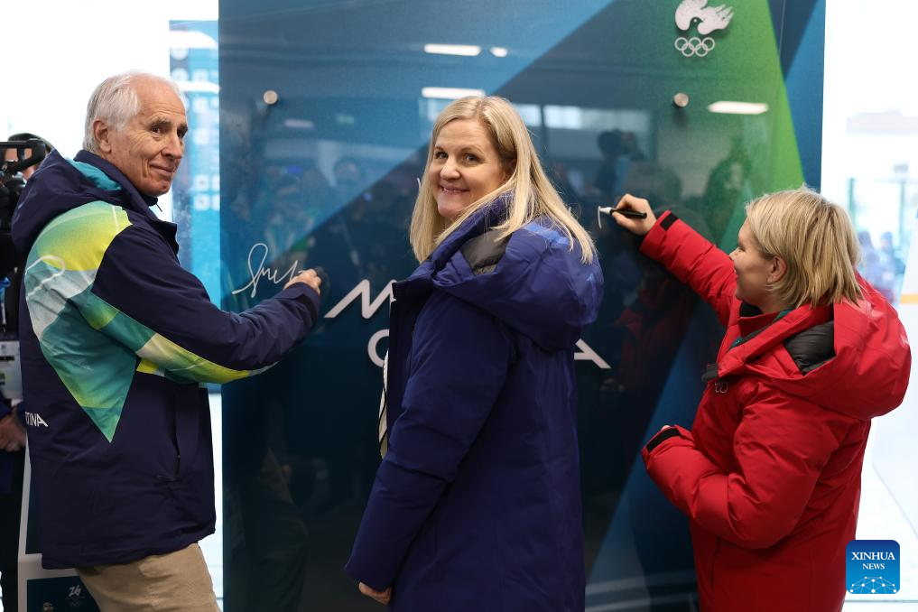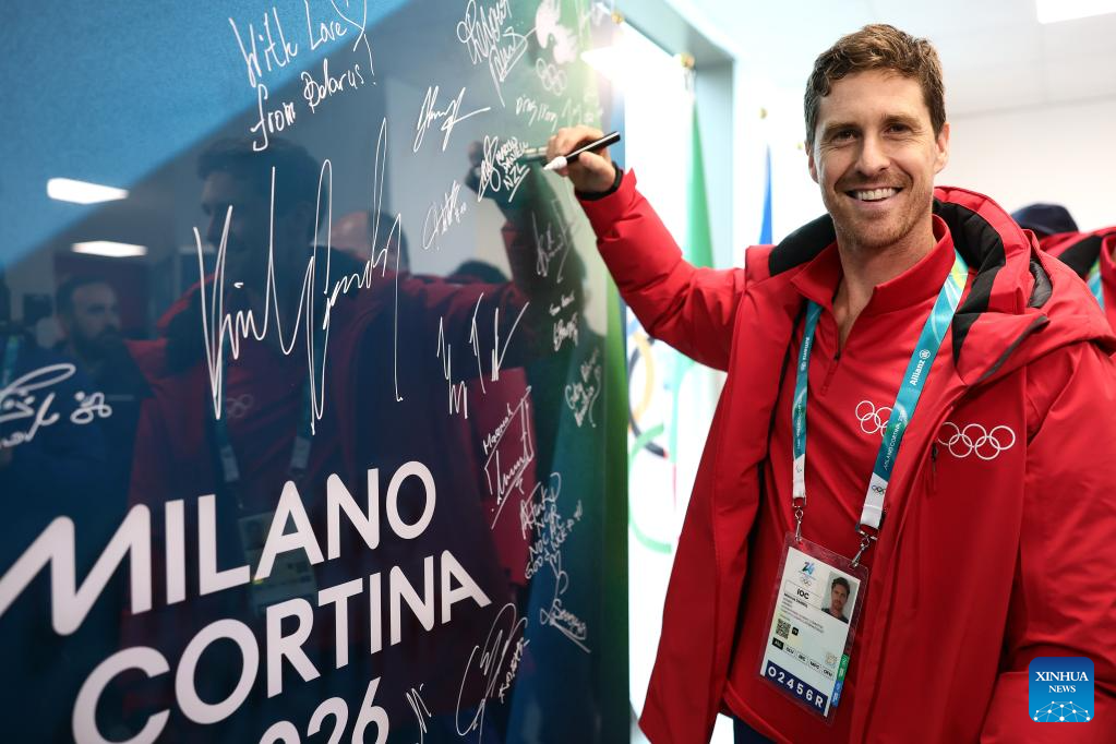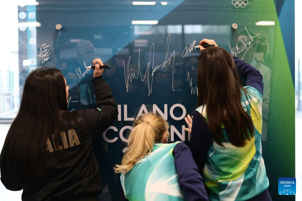 Athletes sign their autographs during the Inauguration of the Olympic Truce Mural with the IOC EB and the IOC Athletes' Commission (AC) at the Olympic Village in Milan, Italy, Feb. 2, 2026. (Andreas Rentz/Pool via Xinhua)