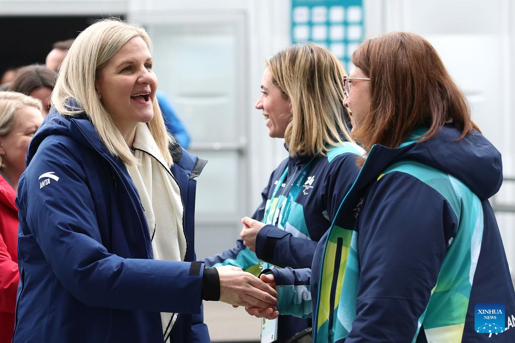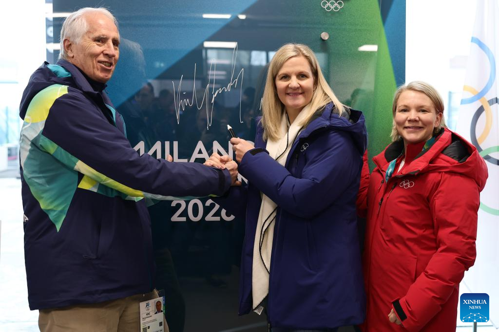 Kirsty Coventry (L), President of the IOC, greets athletes during the Inauguration of the Olympic Truce Mural with the IOC EB and the IOC Athletes' Commission (AC) at the Olympic Village in Milan, Italy, Feb. 2, 2026. (Andreas Rentz/Pool via Xinhua)