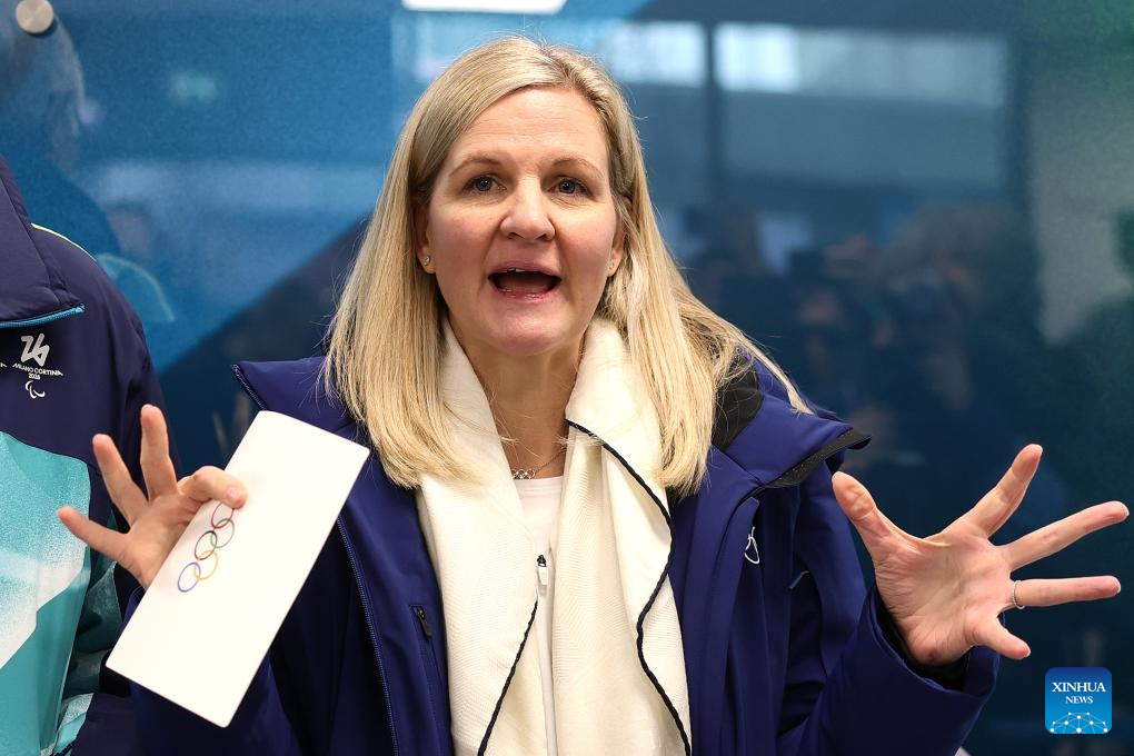 President of the IOC Kirsty Coventry speaks during the Inauguration of the Olympic Truce Mural with the IOC EB and the IOC Athletes' Commission (AC) at the Olympic Village in Milan, Italy, Feb. 2, 2026. (Andreas Rentz/Pool via Xinhua)