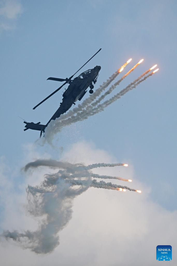 A Republic of Singapore Air Force (RSAF) AH-64D Apache helicopter performs during the media preview for the 10th Singapore Airshow in Singapore, Feb. 1, 2026. The airshow will be held from Feb. 3 to 8 in Singapore. (Photo by Then Chih Wey/Xinhua)