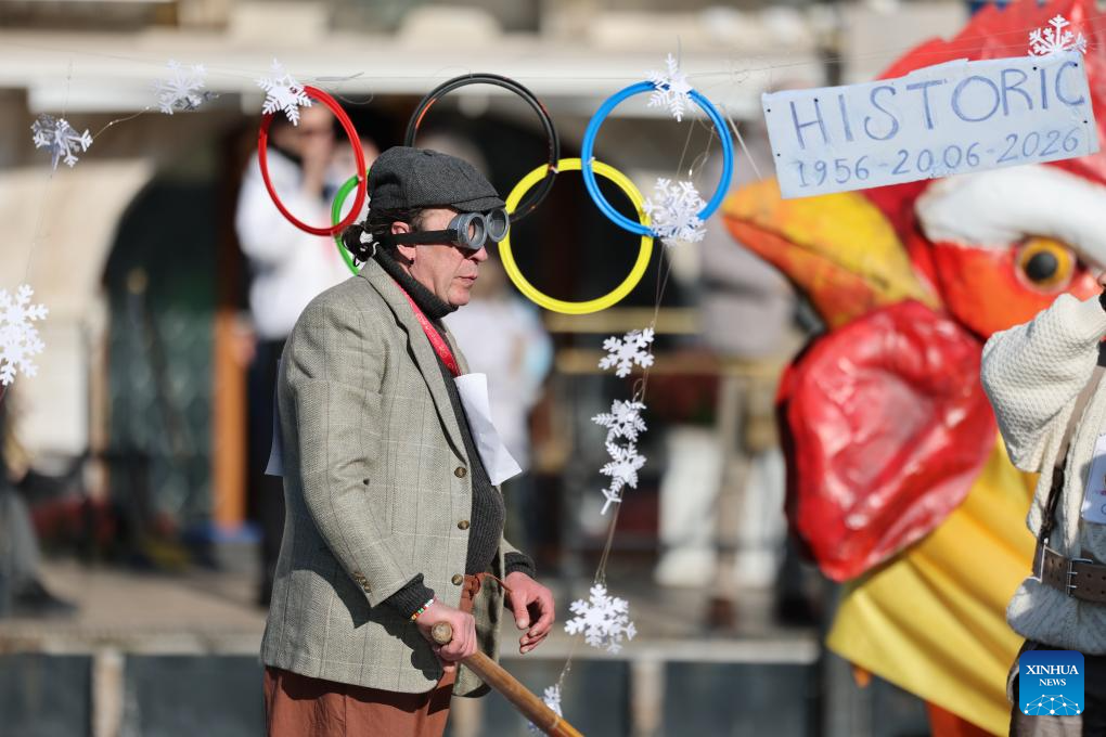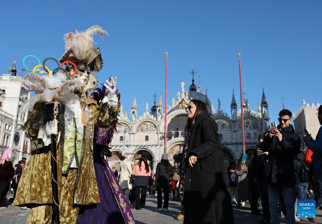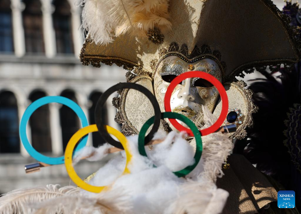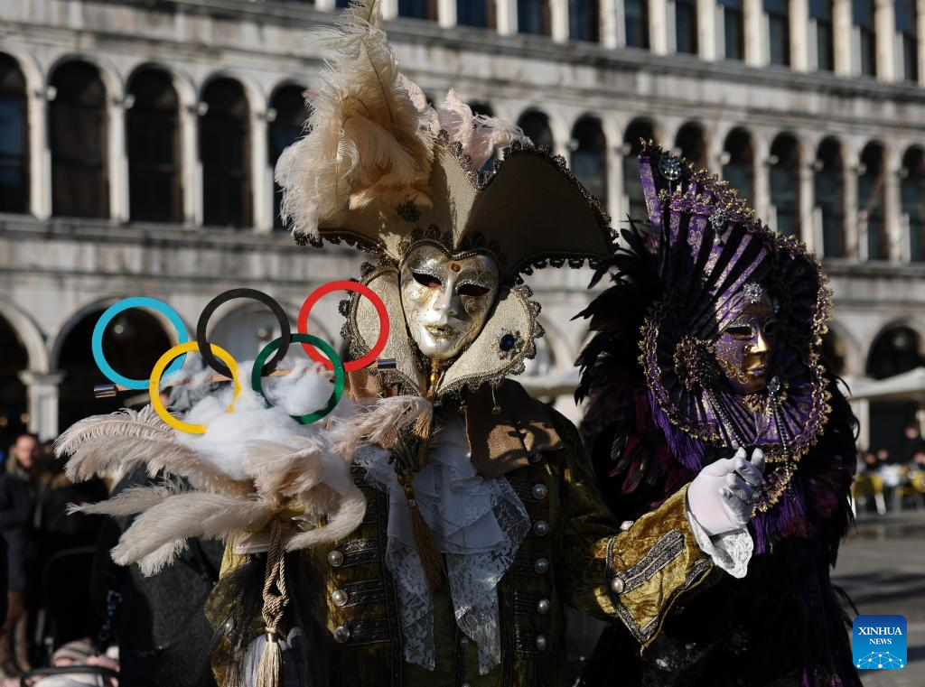 A reveler dressed up in theme of the Olympic Games poses during Venice Carnival at St. Mark's Square in Venice, Italy, Feb. 1, 2026. The 2026 version of the traditional Venice Carnival runs from Jan. 31 to Feb. 17. (Xinhua/Li Jing)