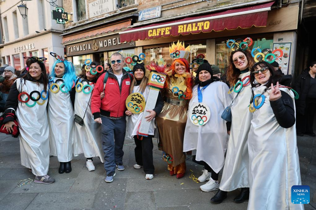 Revelers dressed up in theme of the Olympic Games pose during the Venice Carnival in Venice, Italy, Feb. 1, 2026. The 2026 version of the traditional Venice Carnival runs from Jan. 31 to Feb. 17. (Xinhua/Li Jing)