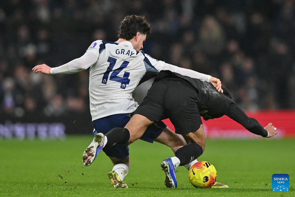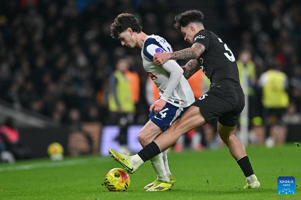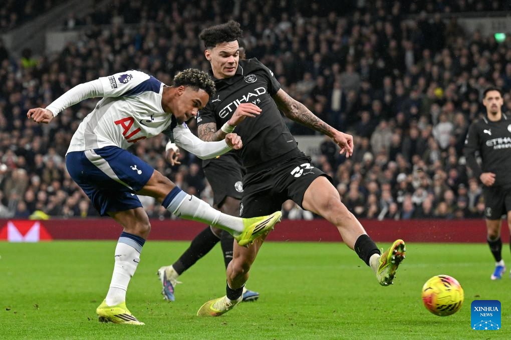 Wilson Odobert of Tottenham Hotspur shoots during the English Premier League match between Tottenham Hotspur and Manchester City in London, Britain, on Feb. 1, 2026. (Xinhua)