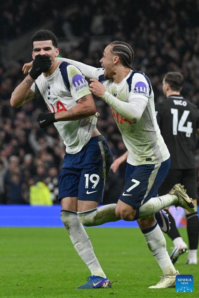 Dominic Solanke (L) of Tottenham Hotspur celebrates after scoring with Xavi Simons during the English Premier League match between Tottenham Hotspur and Manchester City in London, Britain, on Feb. 1, 2026. (Xinhua)