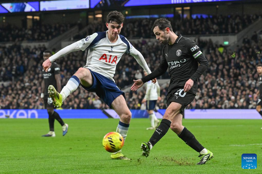 Bernardo Silva (R) of Manchester City vies with Archie Gray of Tottenham Hotspur during the English Premier League match between Tottenham Hotspur and Manchester City in London, Britain, on Feb. 1, 2026. (Xinhua)