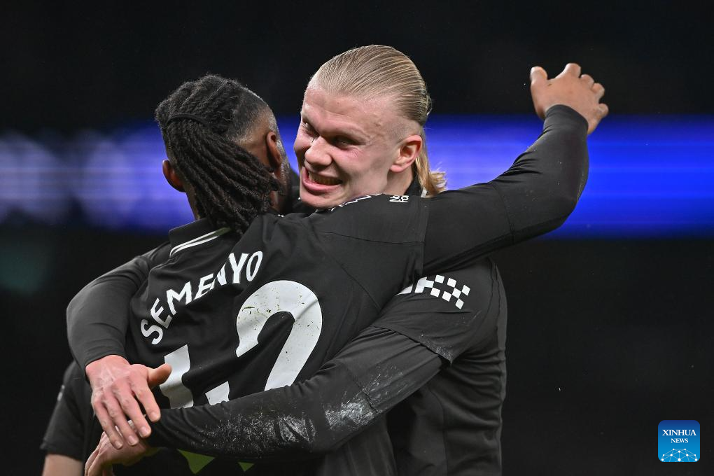 Antoine Semenyo (L) of Manchester City celebrates after scoring with teammate Erling Haaland during the English Premier League match between Tottenham Hotspur and Manchester City in London, Britain, on Feb. 1, 2026. (Xinhua)