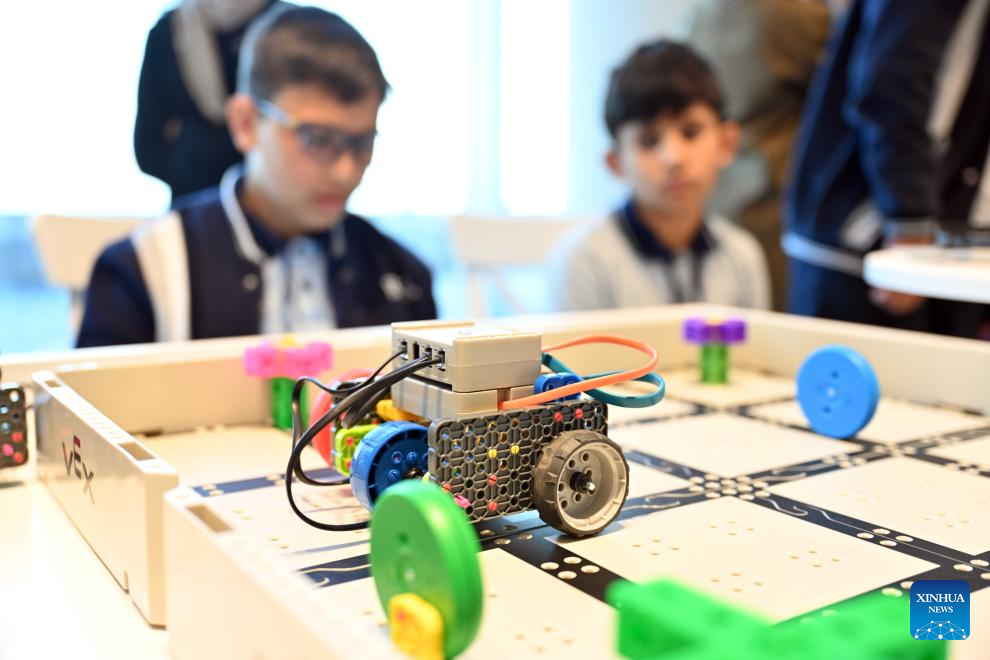Students showcase their invention during the exhibition in Hawalli Governorate, Kuwait, Feb. 2, 2026. An one-day educational technology exhibition was held on Monday, highlighting Kuwait's commitment to advancing education by promoting innovation, digital transformation, and the effective integration of technology into teaching and learning. (Photo by Asad/Xinhua)