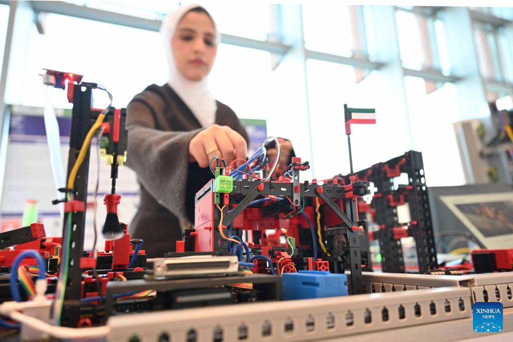 A student showcases her invention during the exhibition in Hawalli Governorate, Kuwait, Feb. 2, 2026. An one-day educational technology exhibition was held on Monday, highlighting Kuwait's commitment to advancing education by promoting innovation, digital transformation, and the effective integration of technology into teaching and learning. (Photo by Asad/Xinhua)
