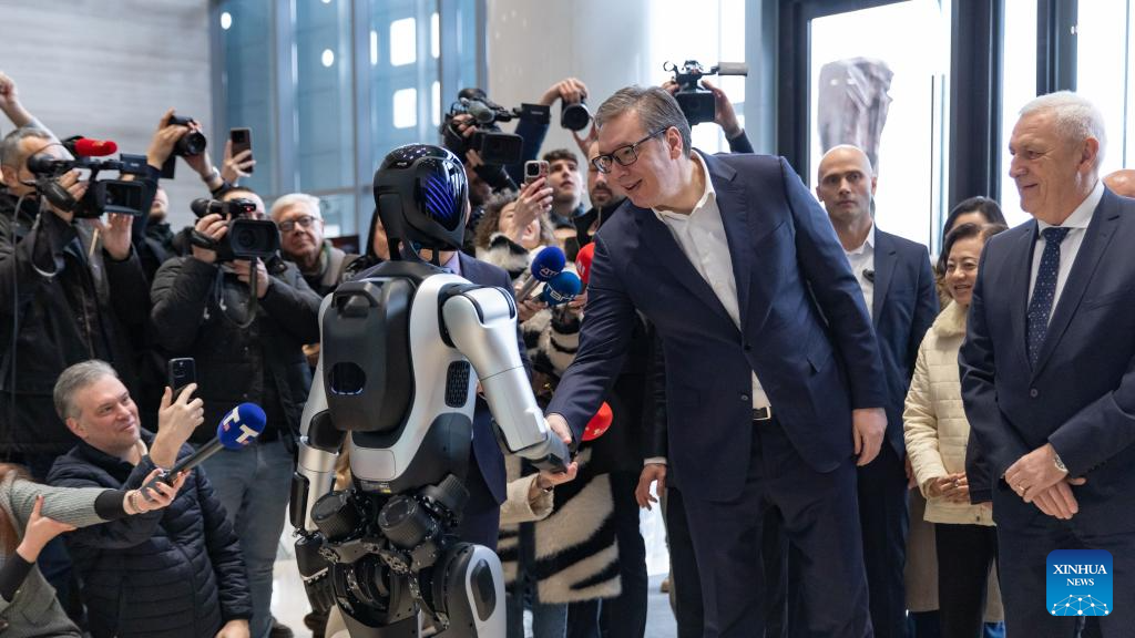 Serbian President Aleksandar Vucic shakes hands with a robot at the Chinese Cultural Center in Belgrade, Serbia, Feb. 2, 2026. (Photo by Wang Wei/Xinhua)