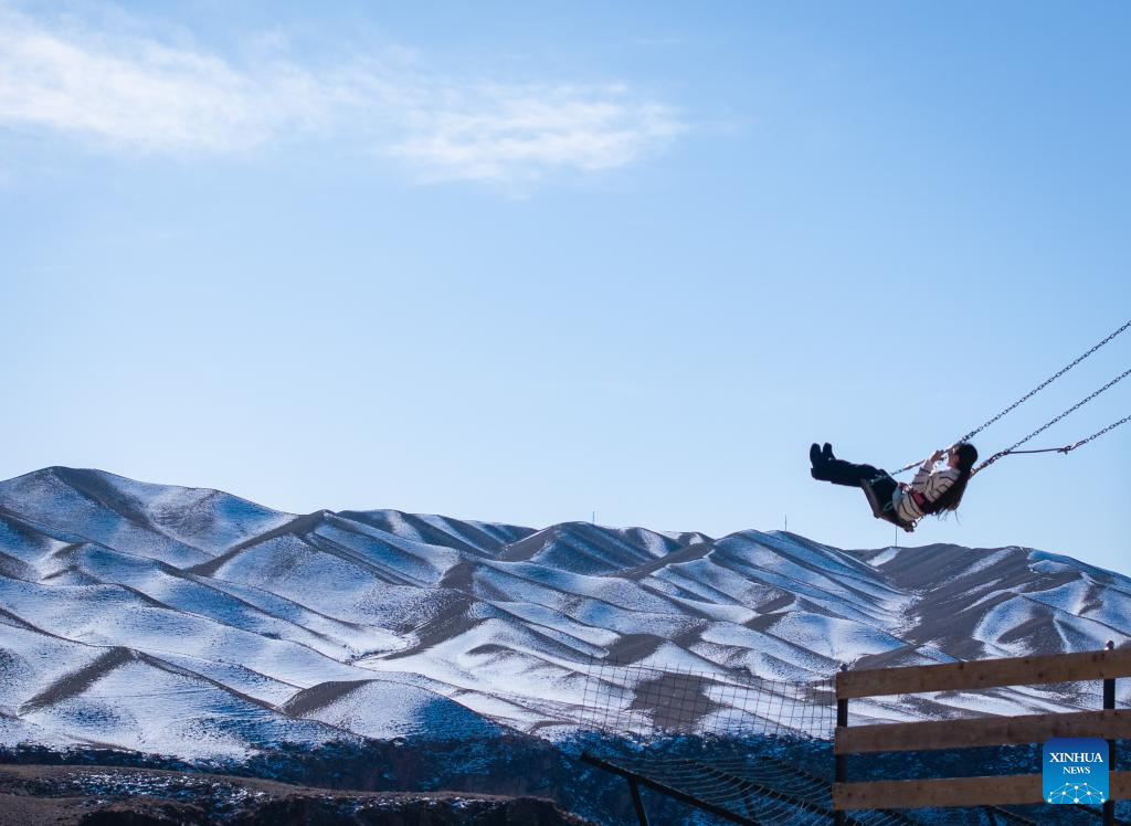 This drone photo taken on Feb. 1, 2026 shows a girl playing on a swing on the edge of a canyon in Almaty Region, Kazakhstan. (Xinhua/Li Renzi)