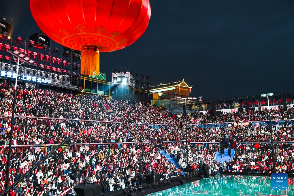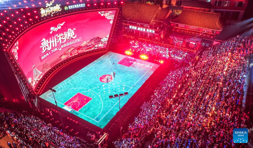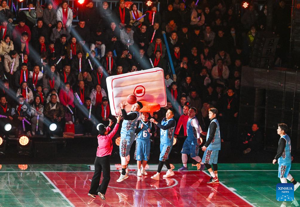 Villagers perform "Guma basketball game" (basketball game played by elder women) during a "village gala" in Taipan Village of Taijiang County, southwest China's Guizhou Province, Feb. 3, 2026.