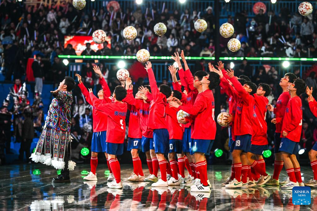 Children perform football skills during a "village gala" in Taipan Village of Taijiang County, southwest China's Guizhou Province, Feb. 3, 2026.