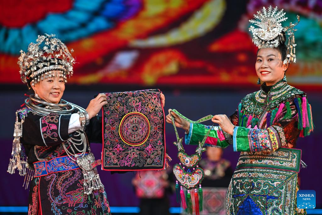 Villagers display folk embroidery works during a "village gala" in Taipan Village of Taijiang County, southwest China's Guizhou Province, Feb. 3, 2026.