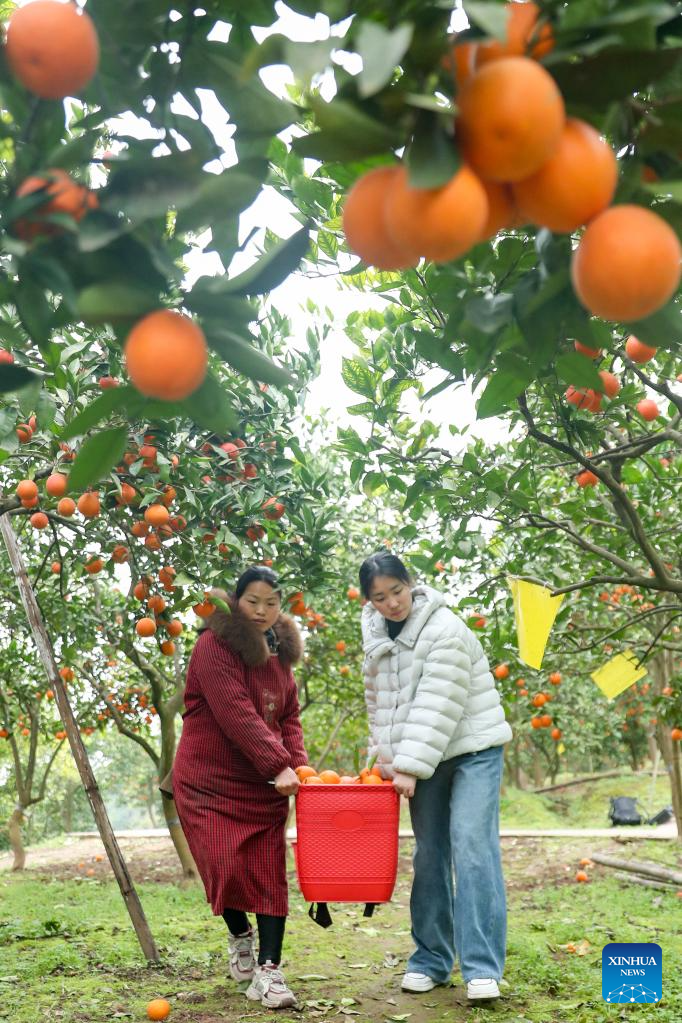 Villagers transfer a basket of freshly picked oranges in Dafoshan Village of Huaying City, southwest China's Sichuan Province, Feb. 4, 2025. Wednesday marks "Lichun," or the Beginning of Spring, the first of the 24 solar terms on the Chinese lunar calendar. Traditionally, it is also a symbolic start of farming work for the new year. (Photo by Qiu Haiying/Xinhua)